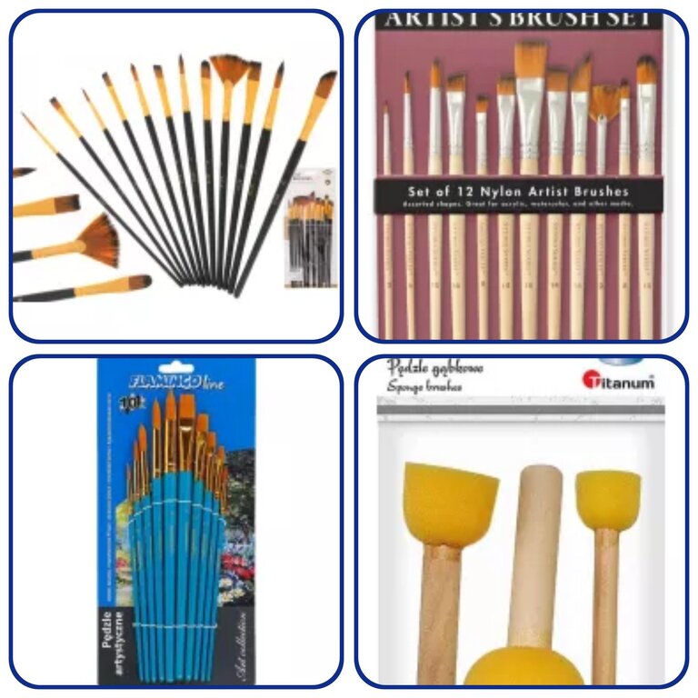 Farby akrylowe są polecane dla początkujących ze względu na łatwość użycia i szybkie schnięcie. Farby olejne dają głębsze kolory, ale wymagają więcej czasu na wyschnięcie. Akwarele są delikatne i transparentne. Pędzle różnią się twardością włosia – do akryli i olejów używa się twardszych, do akwareli miękkich.